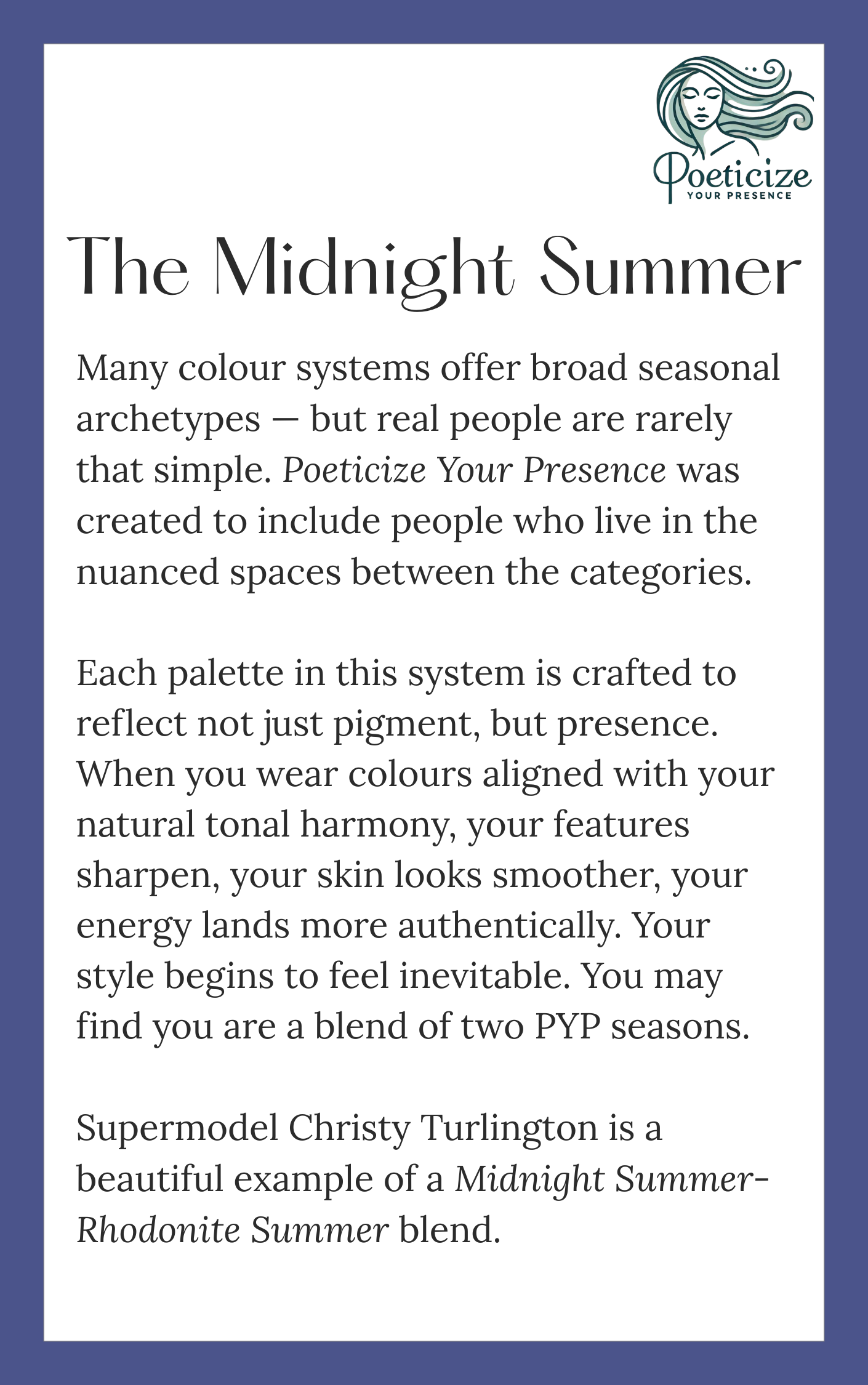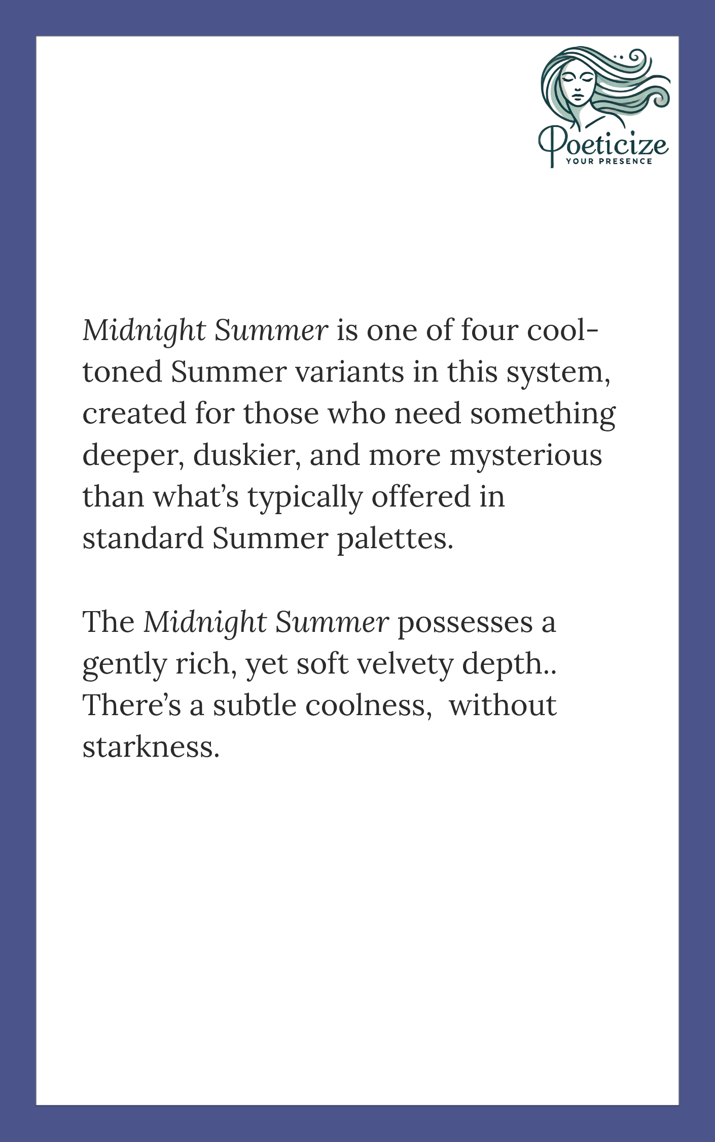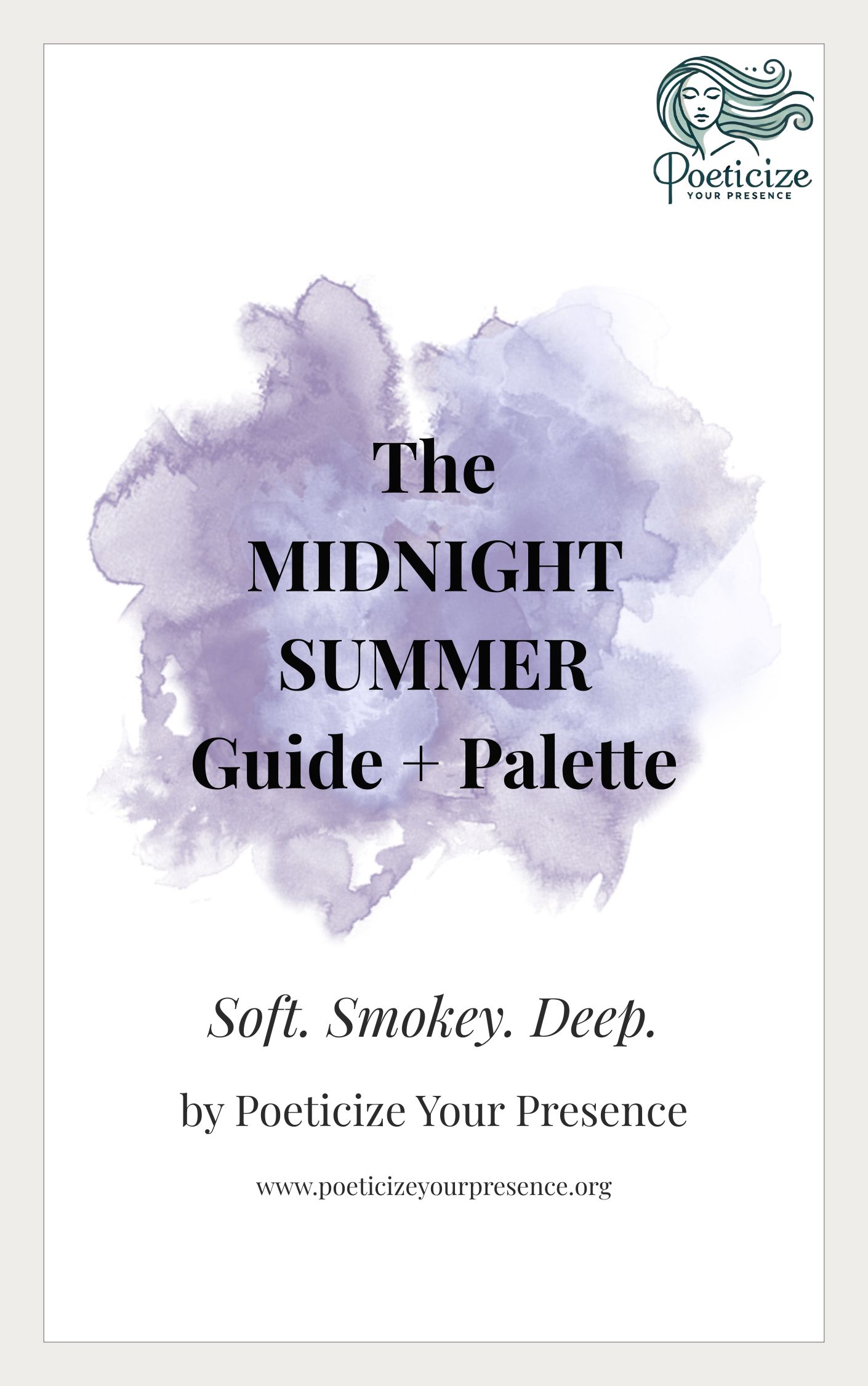 Midnight Summer palette and guide. This beautifully designed ebook is your definitive guide to the Midnight Summer colour type — created for those who need softness and depth in their colours, with cool-neutral tones that flatter and enhance natural harmony.