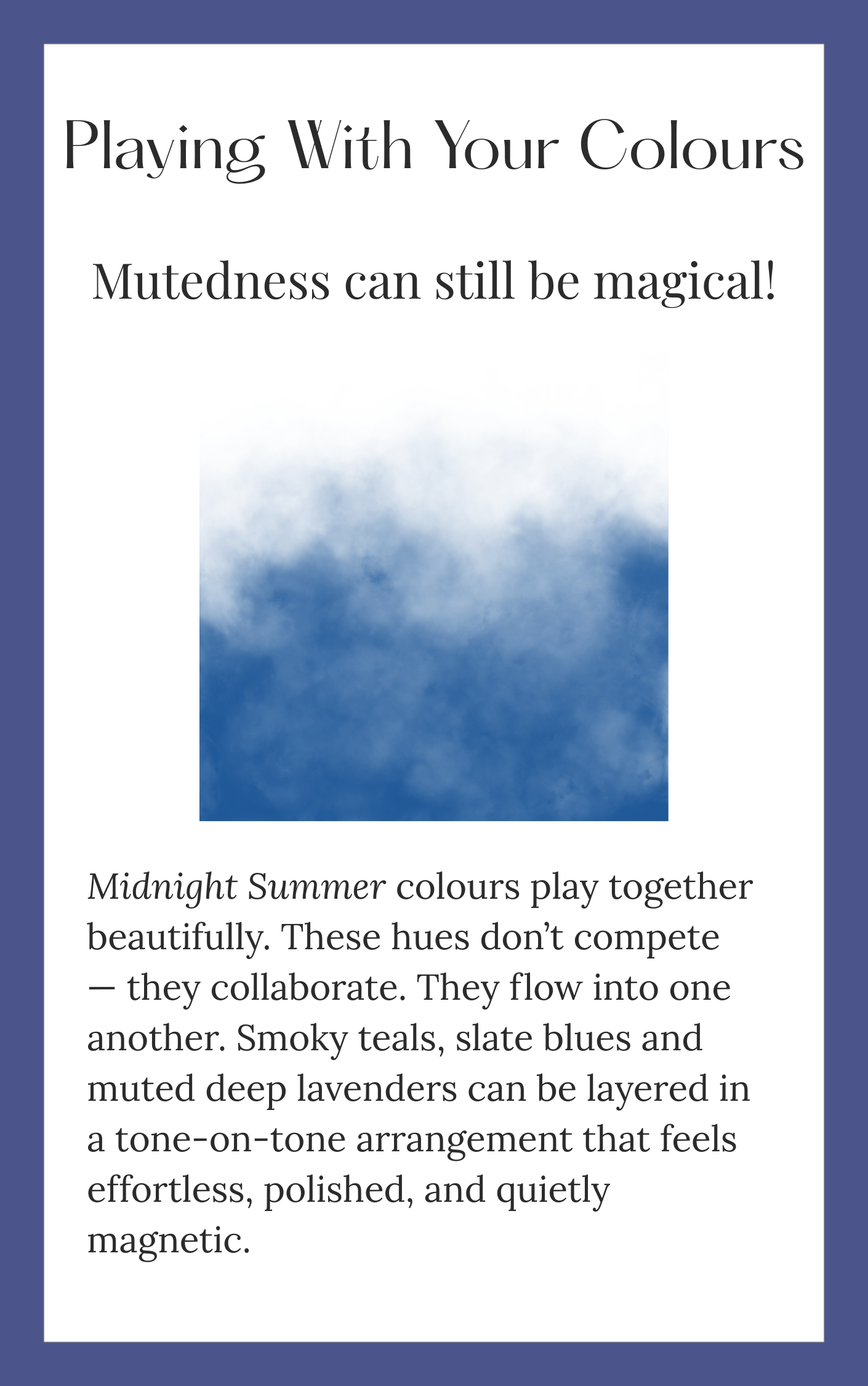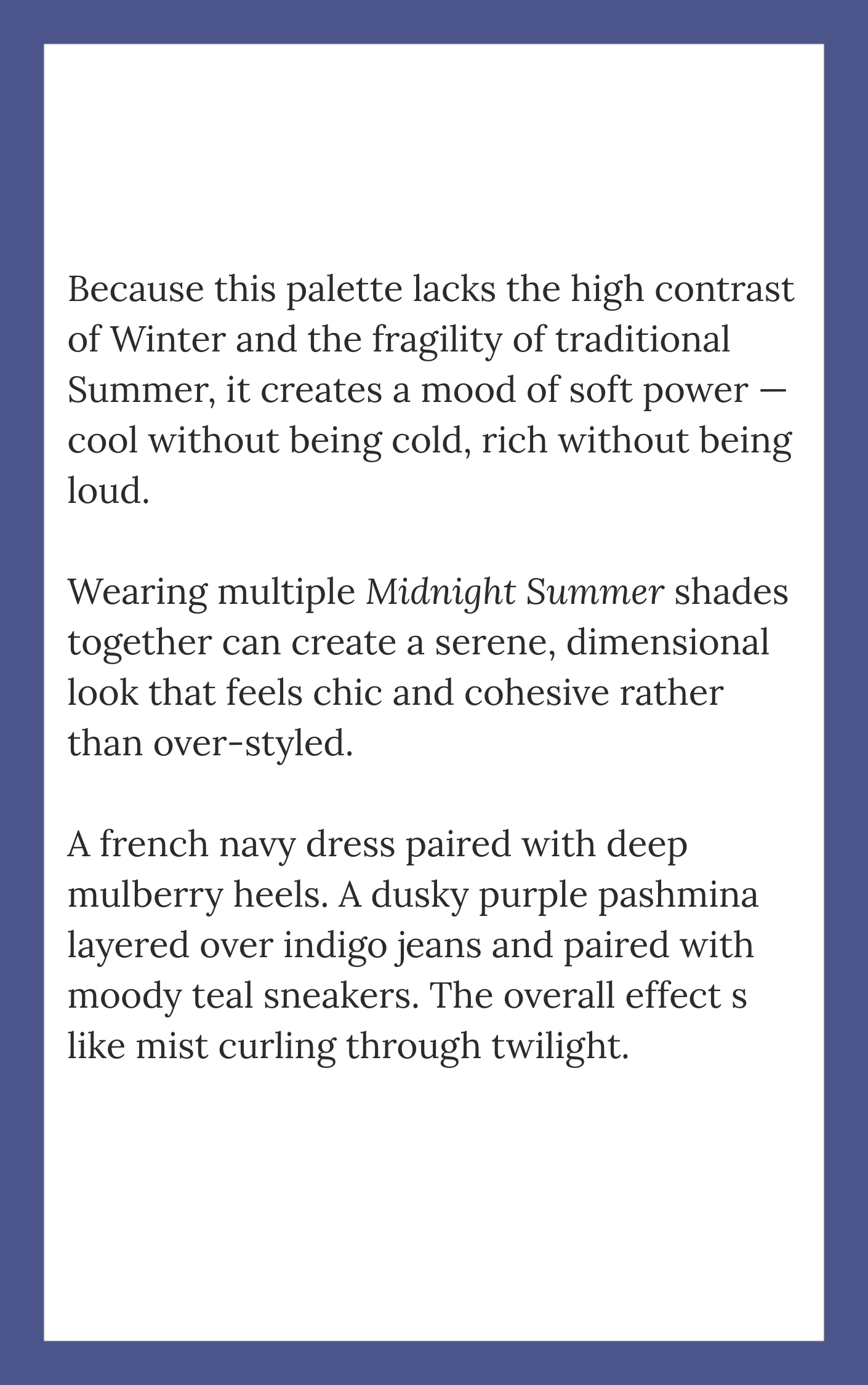 This beautifully designed ebook is your definitive guide to the Midnight Summer colour type — created for those who need softness and depth in their colours, with cool-neutral tones that flatter and enhance natural harmony.